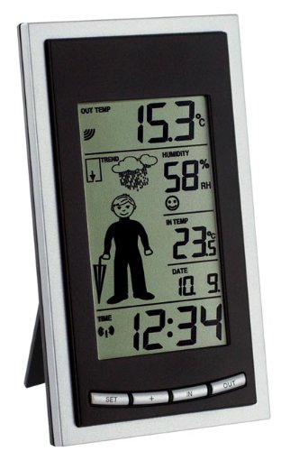 The weather station Diva Weatherboy has 15 different funny weather symbols. The weather indicates through the clothes of the weatherboy, the weather is expected. The station has a lot of other functions such as radio time, outside temperature display and monitoring of indoor temperature and humidity. Forecast with 15 weather symbols of the weatherboy DCF-77 radio clock, controlled by signal from Frankfurt (range 1500 km wide) display size: H 144 W 81 T 32 mm size outdoor-sensor: B 40 B 23 H 128 mm display consists of 5-part for outside temperature, weather forecast, indoor humidity with climate control, temperature, date, time, radio frequency 868 MHz indoor Temperature of -10 to + 60 degrees (resolution 0.1 degrees) outside temperature of -40 to +60 degrees (resolution 0.1 °) indoor humidity 1% to 99% display of minimum and maximum temperature range of display channels max. 100 meters batteries included 4 batteries 1.5 V, LR6